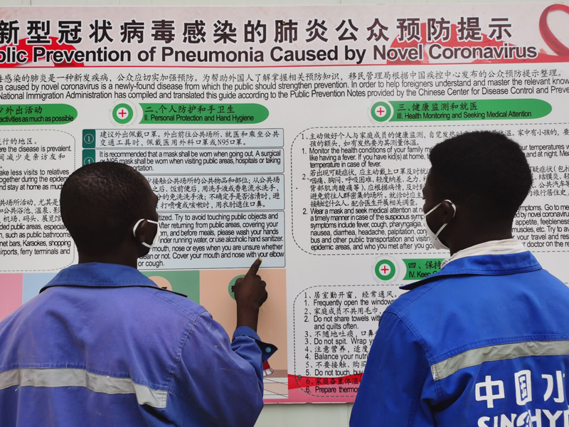 項目部策劃、制作并推出一批全英文《新冠肺炎預防手冊》,簡易便攜,方便當地員工傳閱。手冊包含贊比亞總統疫情防控全國電視講話全文、新冠肺炎公眾預防須知、新冠肺炎——你所應了解的知識以及預防新冠肺炎旅客健康提醒等四部分內容。所有內容均來自中國國家移民局、中國高校附屬醫院和當地衛生部門發布的權威宣傳信息,是當地員工掌握防疫信息的有效渠道。同時在布告欄張貼中英文疫情防控基本知識,供員工日常參考閱讀。